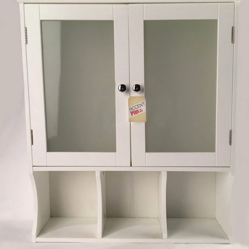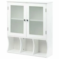 Adding storage to your small space is easy with this slim and stylish wall cabinet. It features two doors with frosted glass and silvery pulls, and below you’ll have three spaces to display necessities or accessories. Perfect for your compact bathroom or kitchen.