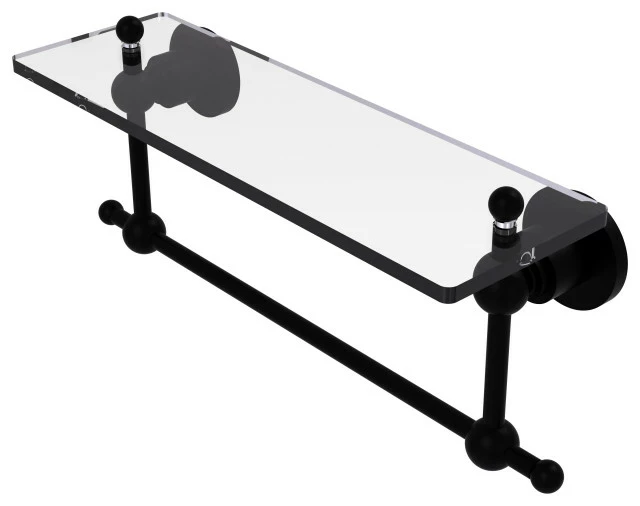 Add space and organization to your bathroom with this simple, contemporary style glass shelf. Featuring tempered, beveled-edged glass and solid brass hardware this shelf is crafted for durability, strength and style. Integrated towel bar provides space for your favorite decorative towels or for your everyday use. One of the many coordinating accessories in the Allied Brass Collection of products, this subtle glass shelf is the perfect complement to your bathroom decor.