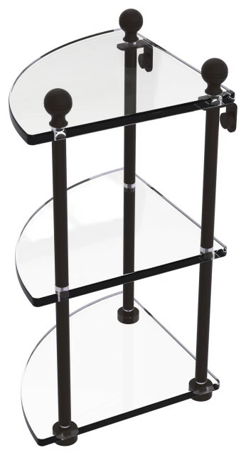 Add space and organization to your bathroom with this simple, contemporary design 3-tier glass vanity corner shelf. Featuring tempered, beveled-edged glass and solid brass hardware this shelving unit is crafted for durability, strength and style. One of the many coordinating accessories in the Allied Brass collection of products, this subtle glass shelf unit is the perfect complement to your bathroom decor.