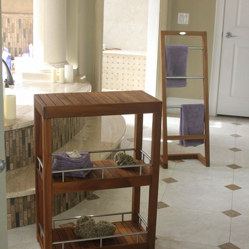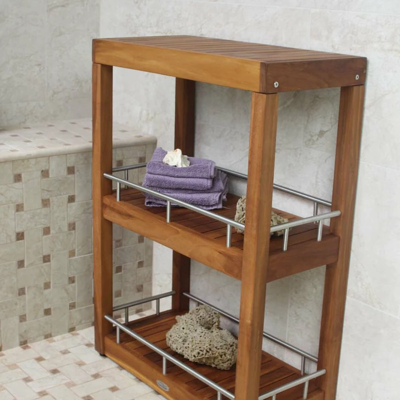 This durable yet elegant teak bath stand will work amazingly in any room inside or outside your home. Transform your bathroom into a luxurious Spa or add a touch of beauty to your pool deck with this classy teak shower stand. The rectangular teak stand comes equipped with three spacious shelves and gorgeous stainless steel accents, giving the storage stand that little extra something to turn heads in your home. Durable and built to last, this teak towel rack includes adjustable rubber padded feet for safety and stability in any location. We offer a 30 day satisfaction guarantee and 5 year warranty on all of our products! (Some assembly required)