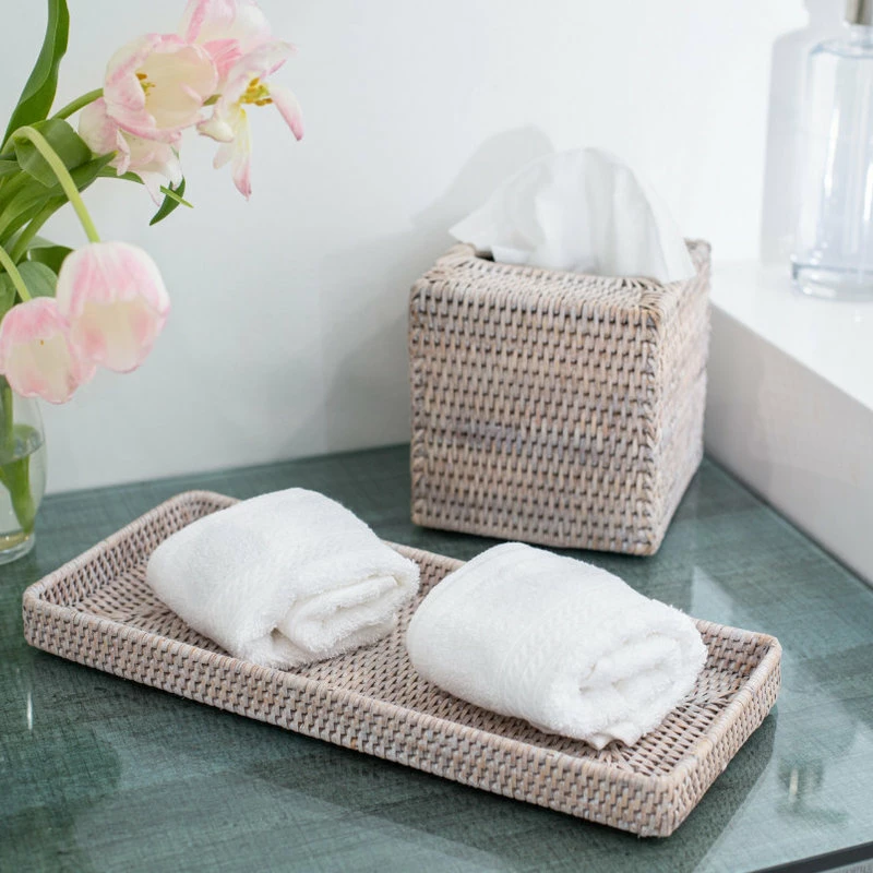 Our Rattan Rectangular Vanity Tray will help keep your space organized while adding a warm elegant touch.