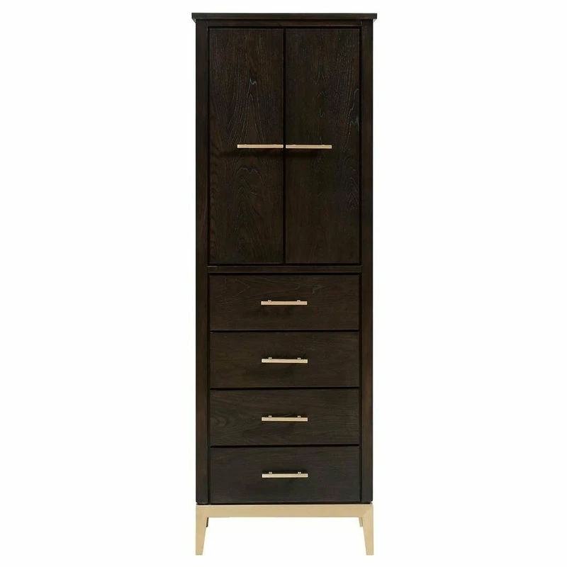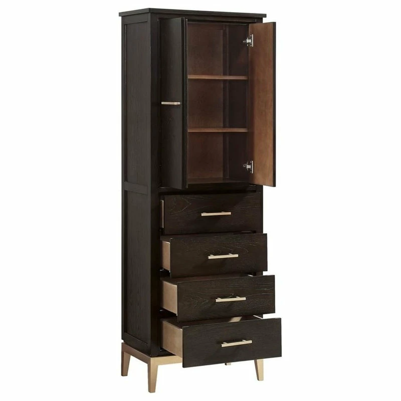 24W x 16D x 70H inchesSolid ash wood, plywoodDark Charcolate finishMatte gold hardware2 soft-close doors, 2 interior shelves4 soft-close drawersAdjustable height levelers