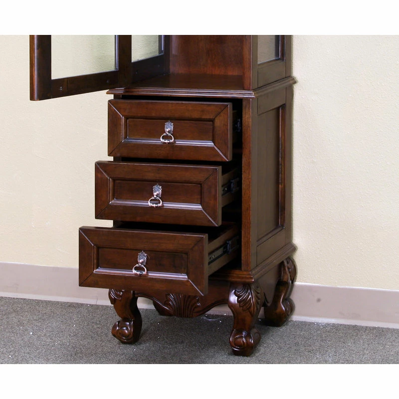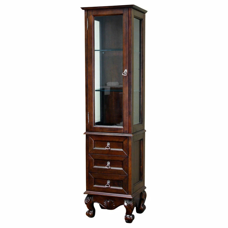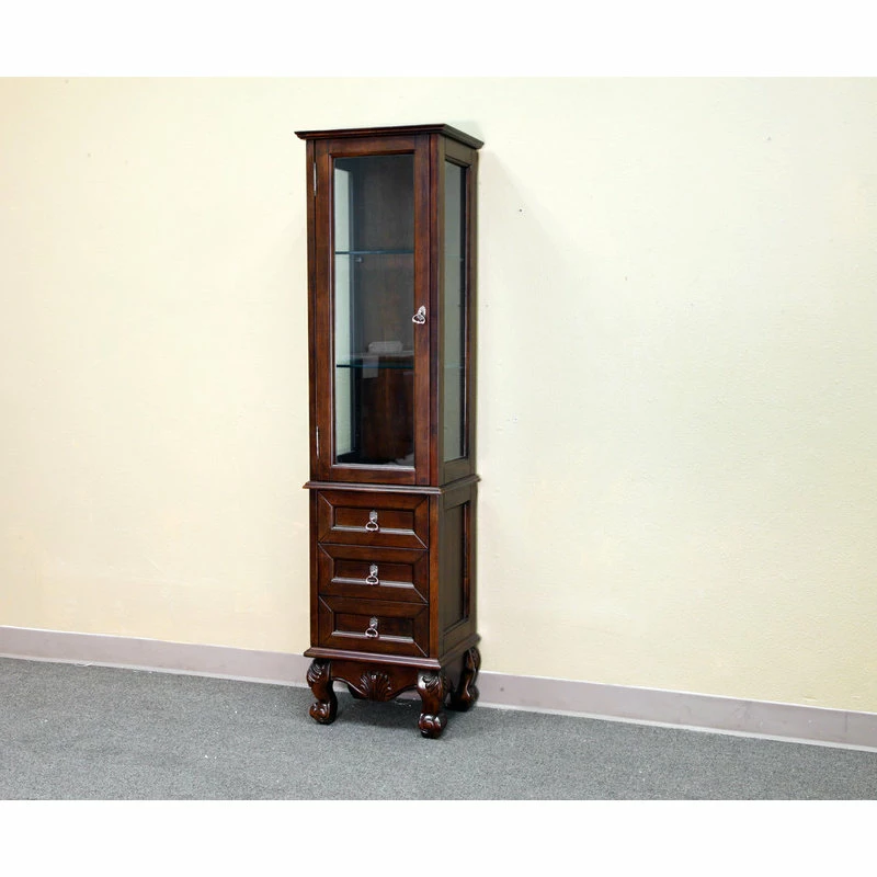 Store your linens” style. This elegant heirloom bathroom Linen cabinet, provides enough space for your washcloths and towels” a stylish way. The solid wood constructed Linen cabinet ensures durability while the lustrous finish adds graceful style. Vanity dimension: 17.3Wx14Dx66.1H * ** * Birch* Medium walnut* Antique brass finish hardware Assembly Required Faucet and mirror not included. Professional installation recommeneded.