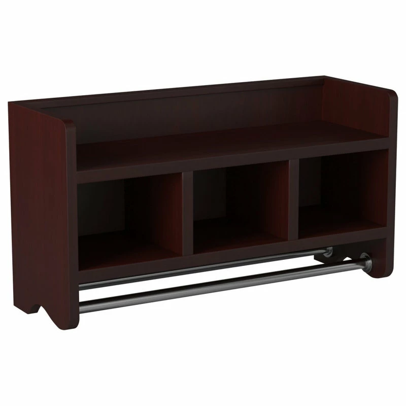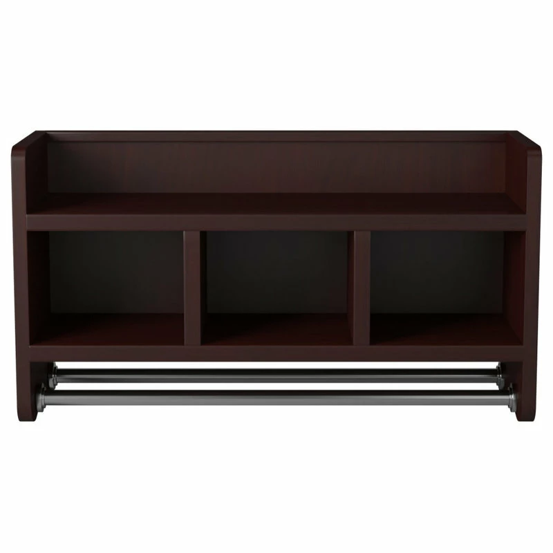 Update your bath with functionality and versatile design. Perfect for your bathroom this 25″ wide shelf features a top shelf, three cubbies, and two towel rods. Store toiletries, stacked washcloths, rolled towels or anything you need to keep organized. The top shelf has a raised edge so items will stay in place. Multiple finish choices will blend seamlessly into any decor. No assembly required, just hang in place for an instant update.