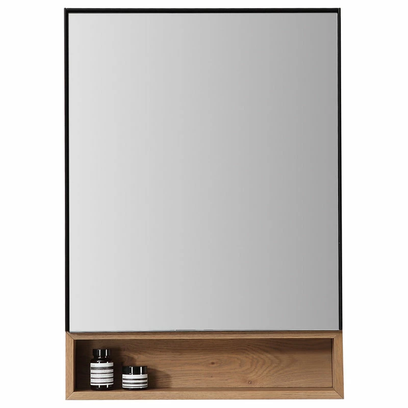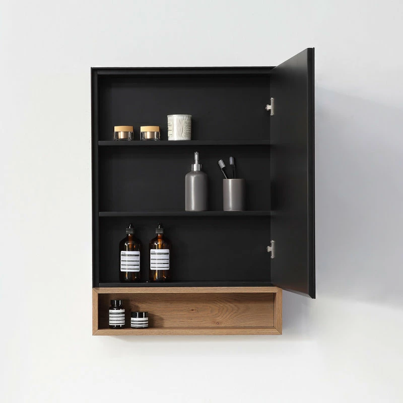 Cartisan Design is pleased to announce the Bergen medicine cabinet, shown in 24-inch Matte Black/Pecan Oak. The elegant mirrored door opens easily to reveal three shelves with ample storage space. Underneath, an additional sturdy shelf made of high quality wood emphasizes the unit’s utility. The clean lines and high quality build will bring a sense of organization and warmth to your bathing space.