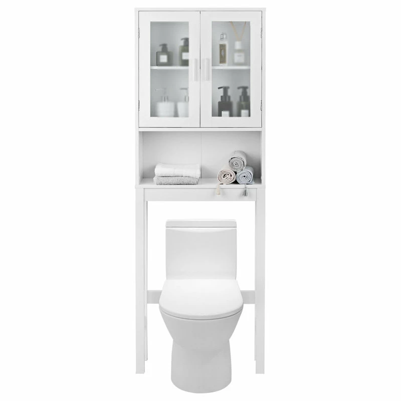 Our brand new clever and versatile bathroom spacesaver allows you to utilize extra space for all your bathroom storage needs. Place this white bathroom space saver around the toilet and add bathroom storage space quickly and easily. Features an two-door cabinet and an open shelf for easy access storage. The cabinet provides excellent storage solutions for bathrooms with limited space. This bathroom space saver features sturdy MDF construction, and its white finish ensures that it will match and accent any existing decor. It is a free standing furniture piece, which conveniently fits over standard toilet tanks and adds easy storage for roll paper and other bathroom necessities. Donโt hesitate to buy it!