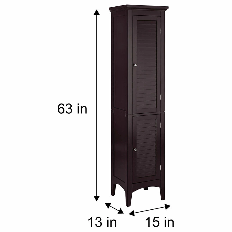 Upgrade your home storage while adding classic style with the Elegant Home Fashions Glancy Wooden Tall Tower Cabinet with Storage. This decorative cabinet features a timeless dark brown finish with a crown molded top and skirting, chrome-finished knobs, louvered doors, and both shaker-style and arched legs for a beautiful addition to your space. The double-tier louvered doors house 4 interior shelves, with 3 tiers on the top and 2 on the bottom for a functional storage solution. Constructed from durable engineered wood with included anti-tipping hardware, this storage unit is built to provide you with long-lasting organization. Easy, step-by-step instructions and all of the hardware needed for installation are included for quick assembly. Purchase this stylish tower cabinet alone or with other items from the Glancy collection for a cohesive, updated look. The Elegant Home Fashions Glancy Wooden Tall Tower Cabinet with Storage measures 15″ x 13″ x 63″ to provide accessible storage without taking up too much space in your living area or bathroom.