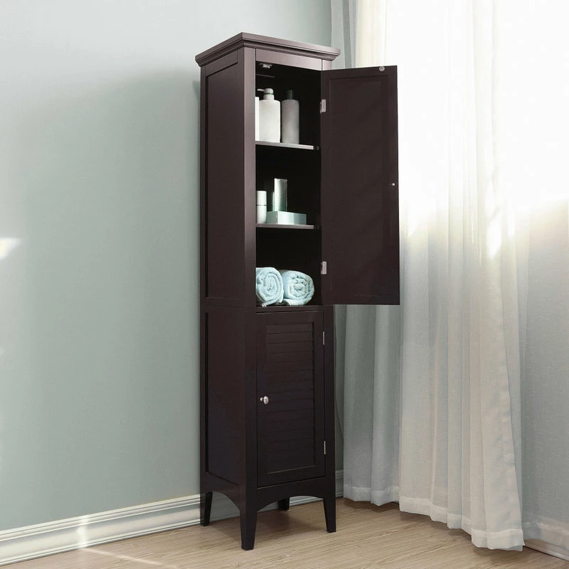 - FUNCTIONAL: This tall linen cabinet has double-tier louvered doors with four interior shelves, with three tiers in the top and two in the bottom section. Allowing a lot of extra storage room for soaps, shampoos, towels, toiletries, and more but taking up little to no bathroom space.