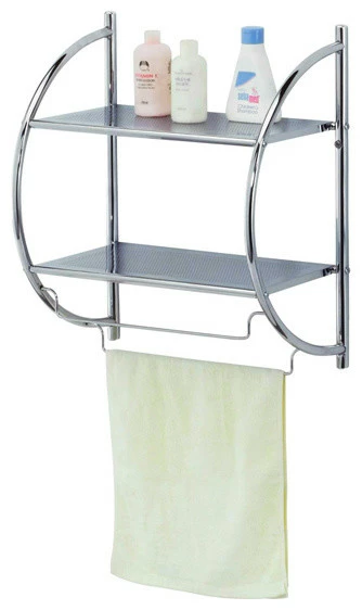 Two tiered bath shelf provides extra storage space for toiletries, towels, and bath essentials in the bathroom. Chrome rust resistant finish. Features two swivel towel racks underneath shelf. Mounts on wall.