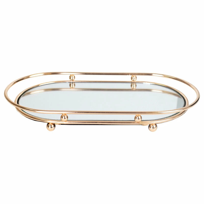 Luxury Mirror Vanity Tray, GoldProvide a beautiful gathering spot for all your perfumes, essential oils and more. The vanity mirror features crystal clear glass bottom for a touch of dimension and a sleek frame for a modern flair. Great to place on the dresser to hold accessories and perfect to use in the bath for all your cosmetics.MULTI-USE FUNCTIONALITY- Great as a decorative tray. It can be used for any occasion or any room in the house. Use it in the bathroom to provide a beautiful backdrop for your bath ensemble, perfumes, and personal grooming items. Or prop it on you bedroom dresser to proudly beautiful spot for your jewelry and accessories.USE ANYWHERE: With its compact shape it fits effortlessly on a bathroom vanity, dresser, entryway or ottoman without taking up too much spaceGREAT FOR ANY DECOR: The contemporary sleek frame works great for all types of decor, while the mirror bottom adds a touch of sophistication.DESIGNED TO LOVE AND LAST Made of sturdy steel with crystal clear mirrored bottom that adds a touch of elegance to any room in the house.