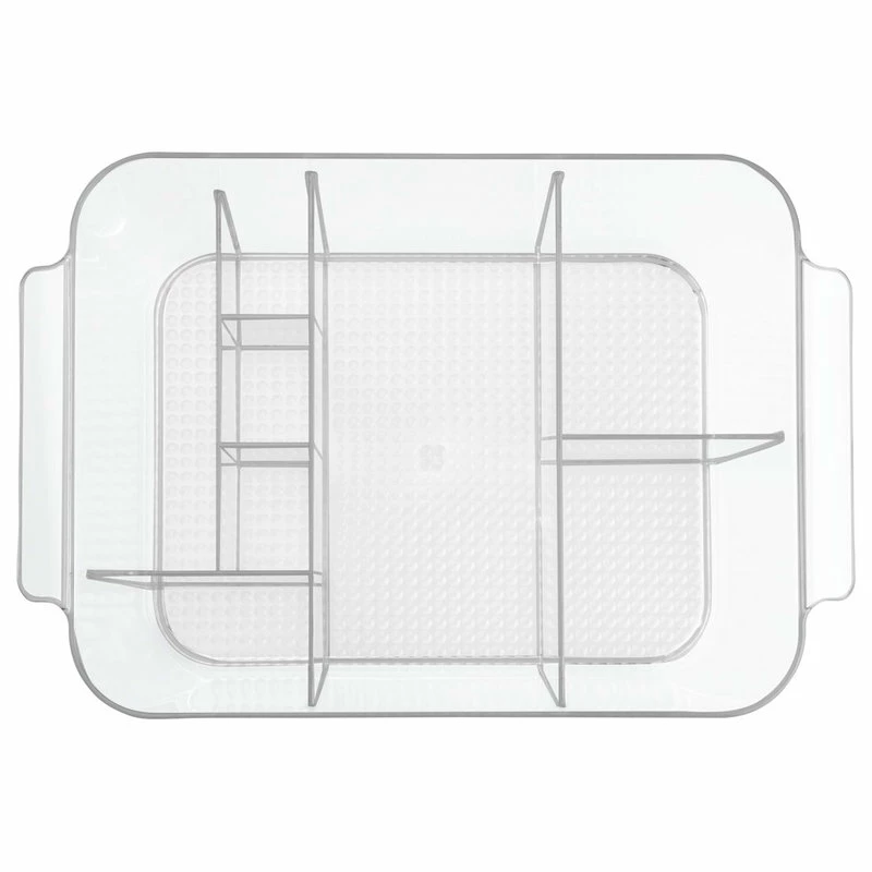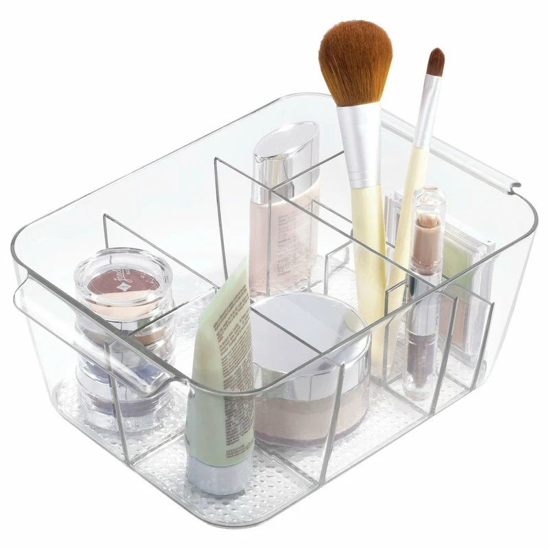 The iDesign Clarity Divided Cosmetic Bin conveniently stores your makeup and cosmetic accessories. Organize all of your make-up essentials for easy access. The durable, handled container includes eight compartments to store cosmetics, brushes, and toiletries! The clear plastic makes it simple for you to find your favorite lipstick fast. Measuring 7.1″ x 10.4″ x 3.6″, iDesign’s Clarity Divided Cosmetic Bin is perfect for countertop or vanity!