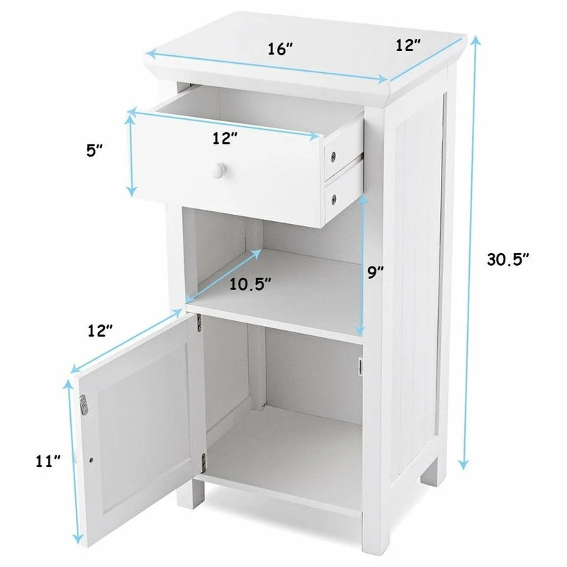 This bathroom cabinet combines style and functionality to create a modern home furnishing is ideal for use in bathroom bedroom and any space to store items. With white finish elegant and simple appearance, this cabinet will well match with your furniture in your home. It can perfectly blend in various decoration styles and leave your guests a deep impression. Featuring drawers, one open cube and hidden cabinet area behind the door, this cabinet adds storage space to your room. It is an ideal option for a small bathroom. It has sufficient space for storing and organizing linens, toiletries, and bath essentials like soaps, shampoos, body wash, and more. And, the design of the door not only to hide the item but also to keep moisture and dust out. This cabinet is made of thick MDF board with smooth paint, waterproof and anti-corrosion, which ensures durable and sturdy.