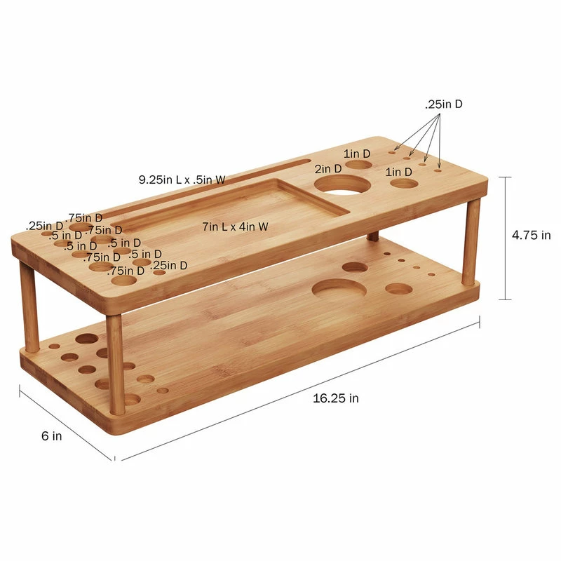 PRODUCT DETAILS- Material: Bamboo. Overall Dimensions: 16.25 L x 6 W x 4.75 H. Brush Holder Dimensions: .25 – .75 Diameter. Mirror Slot: 9.25 L x .5 W. Main Compartment: 7 L x 4 W. Round Holes: 1-2 Diameter. Color: Natural Finish.