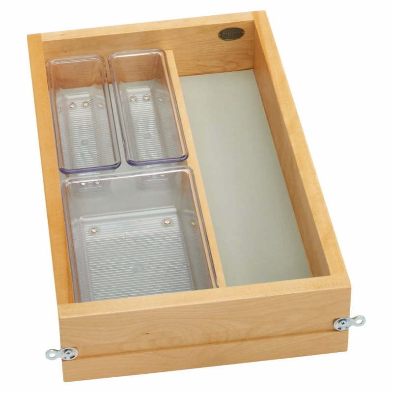 - Included: (1) Wood Drawer, (1) pair of Blum slides, (2) acrylic bins and mounting hardware