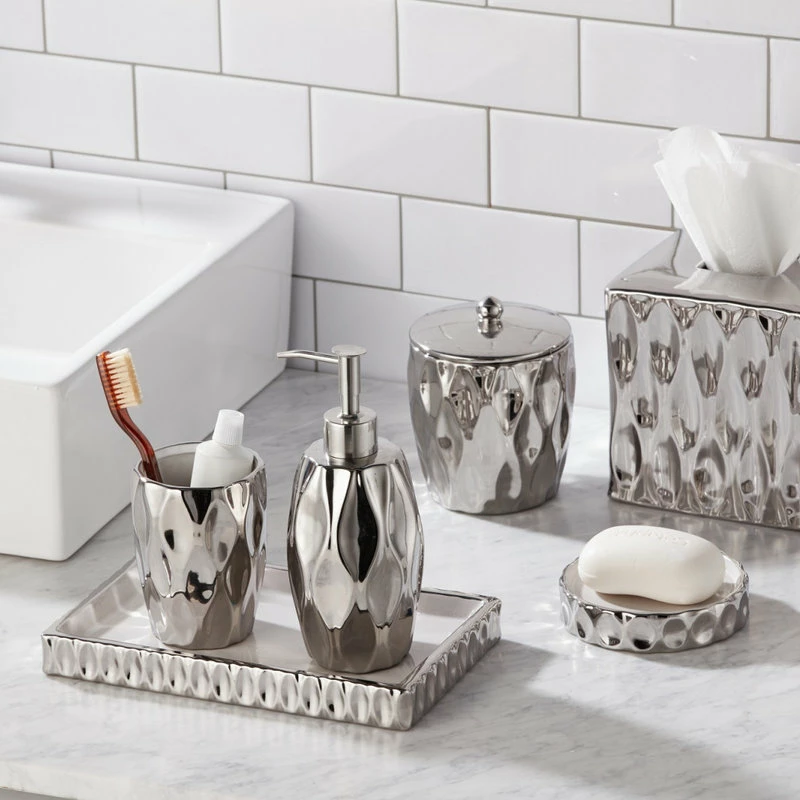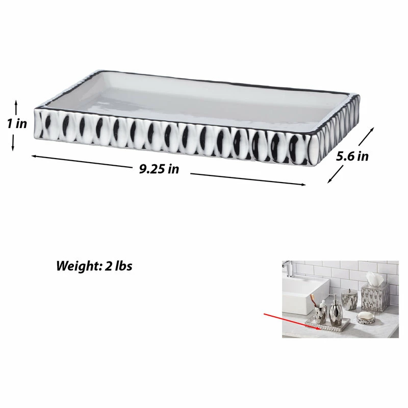 SKU: WSE-07 Categories: Bathroom Organizers, Bathroom Storage & Vanities Tags: Amenity tray, Bath Accessories, Bath accessories set, Bath Collections, Bath organizer, Bath sets, Bathroom accessory sets, Bathroom organizer, Bathroom tray, Ceramic, Coastal, Modern, Roselli trading company, Silver, Silver Wave, Transitional, Tray organizer, Vanity tray