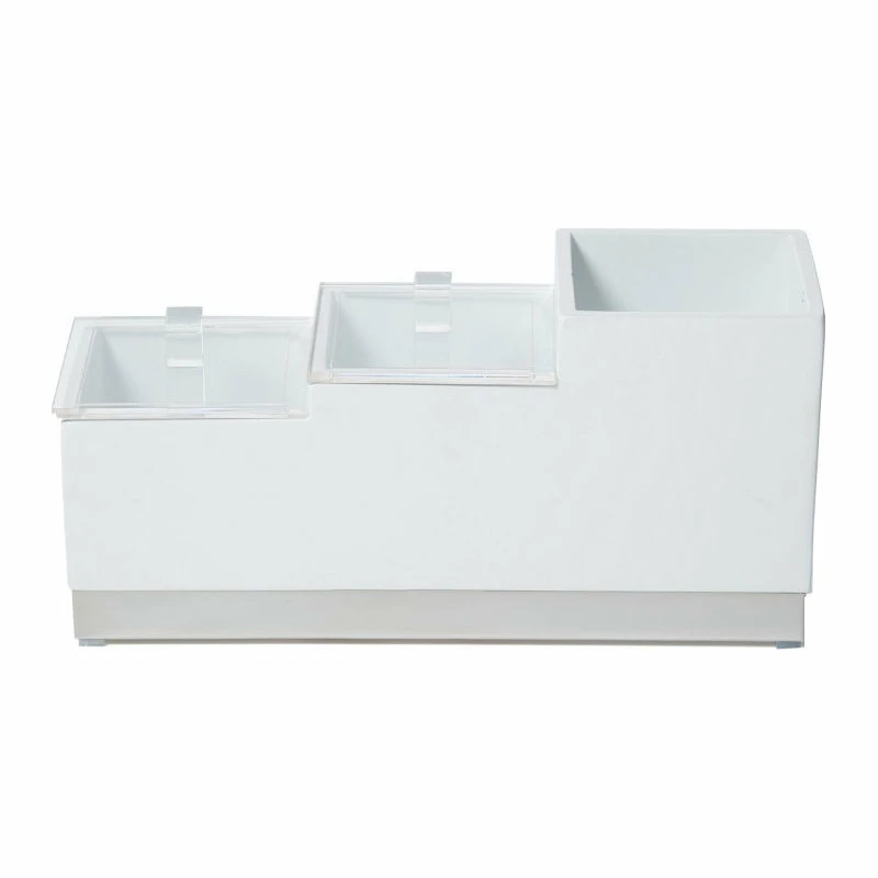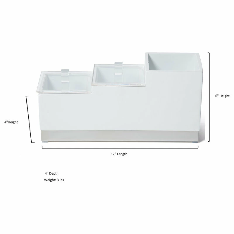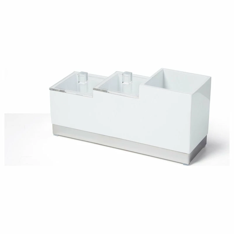 Declutter your countertop and find a place for your brushes, toothpaste tube, cotton balls, and sundries. Two clear lids lets you look inside and the open box is for taller items. Matches our classic Suites collection bath accessories.