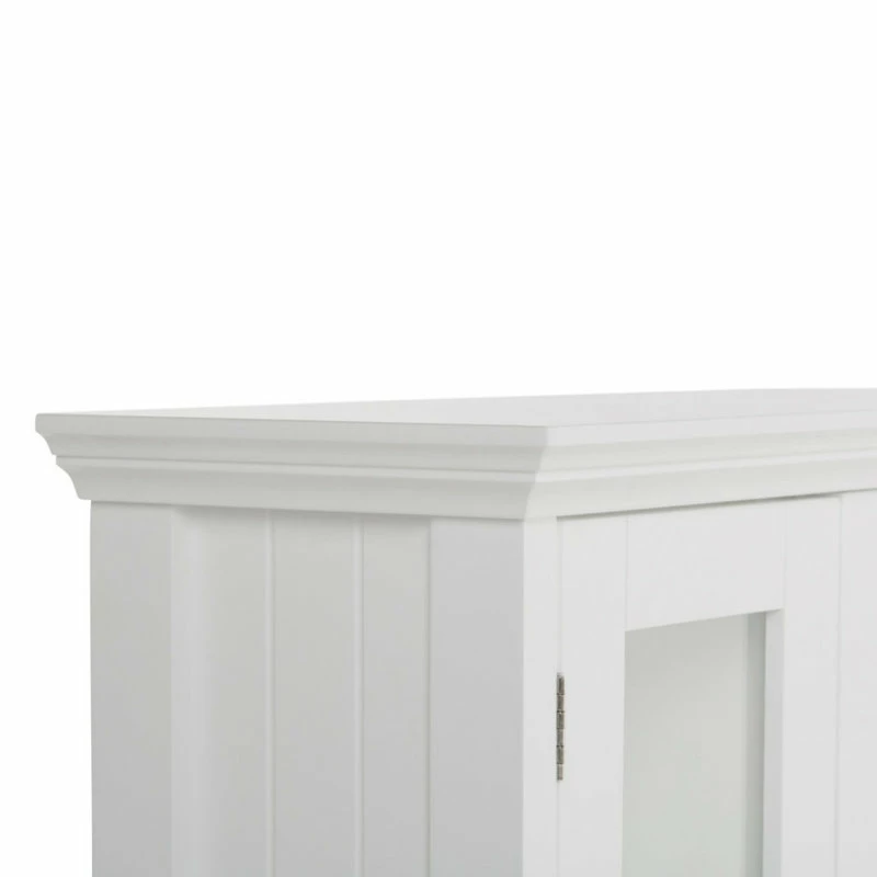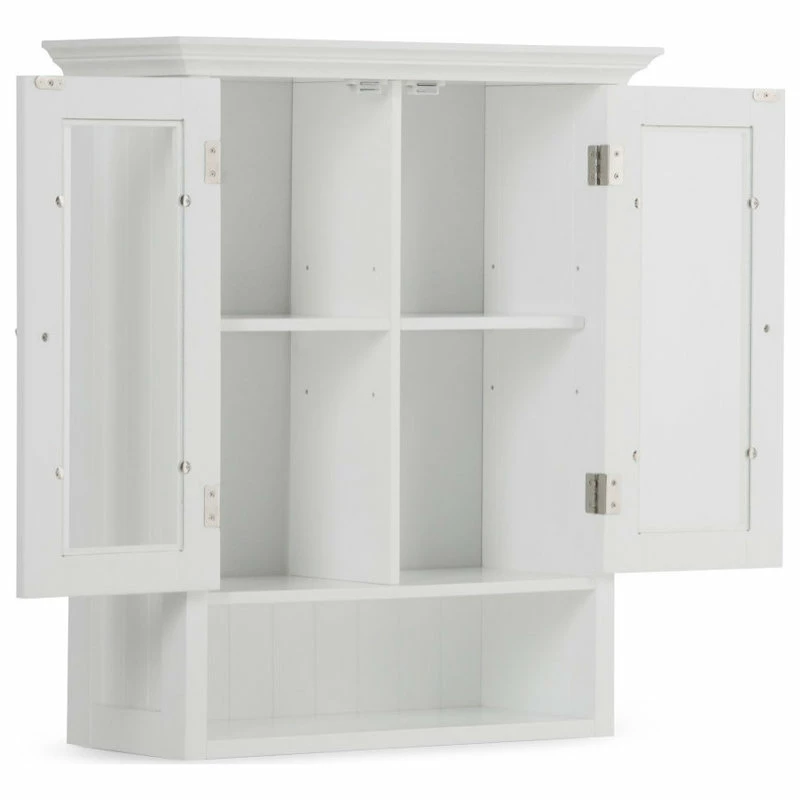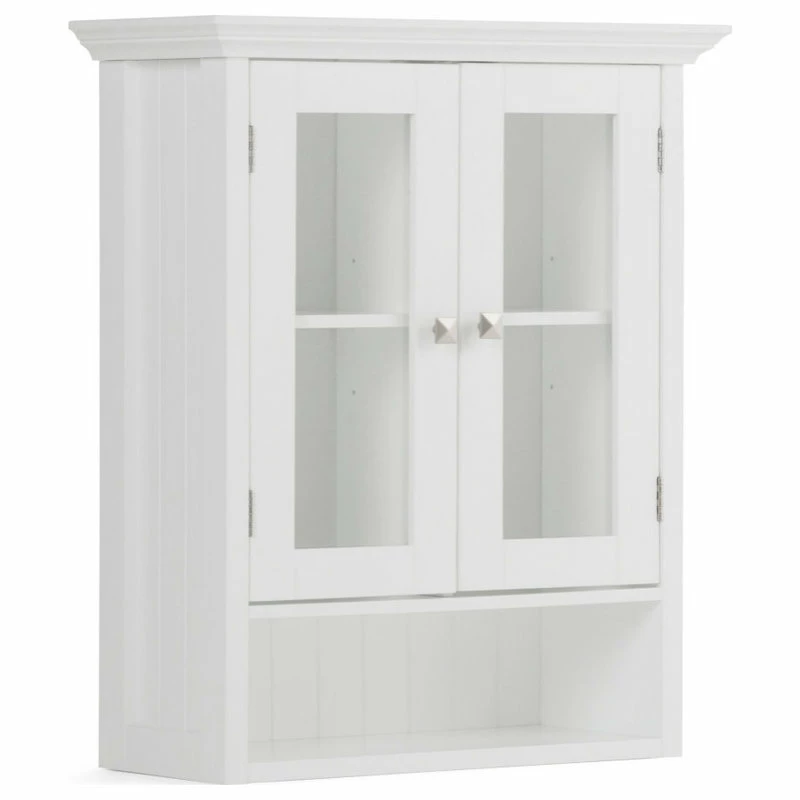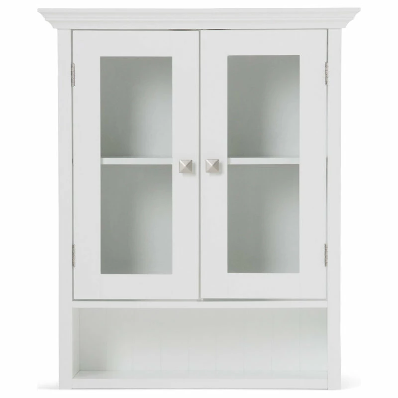 Keep all of your bathroom essentials neat and orderly with the Acadian Double Door Wall Cabinet. Two tempered glass doors help keep clutter out of sight, while an open shelf provides ample room for toiletries and other items. Adjustable shelving inside the cabinet allows you to customize the space to suit your needs. Its Pure White finish will easily coordinate with existing bathroom decor.