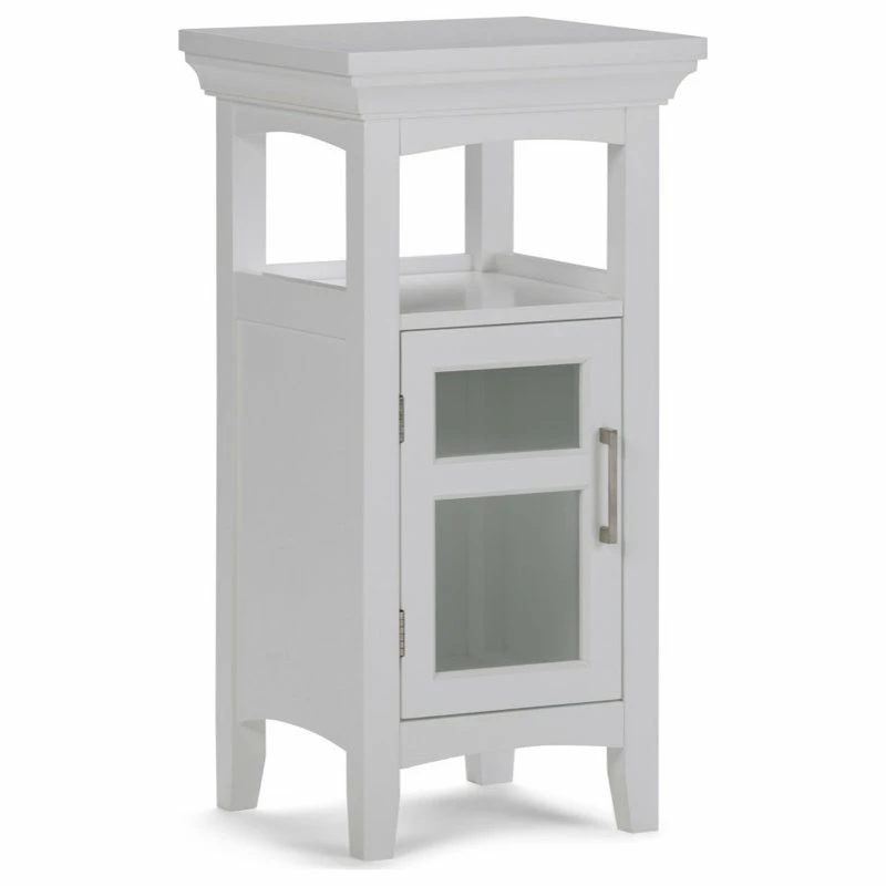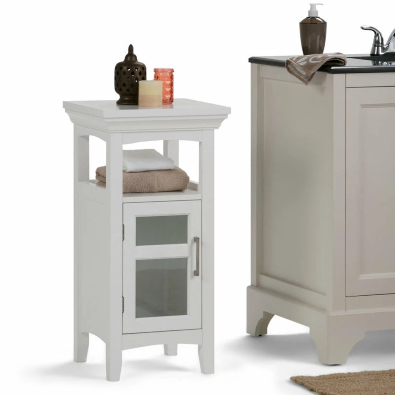 Have a little unused spot in your bathroom? This compact floor storage cabinet would be perfect! One interior shelf behind a tempered glass door and an open shelf provides storage space for towels, toiletries or paper supplies. This beautiful cabinet offers a surprising amount of storage for such a small footprint.
