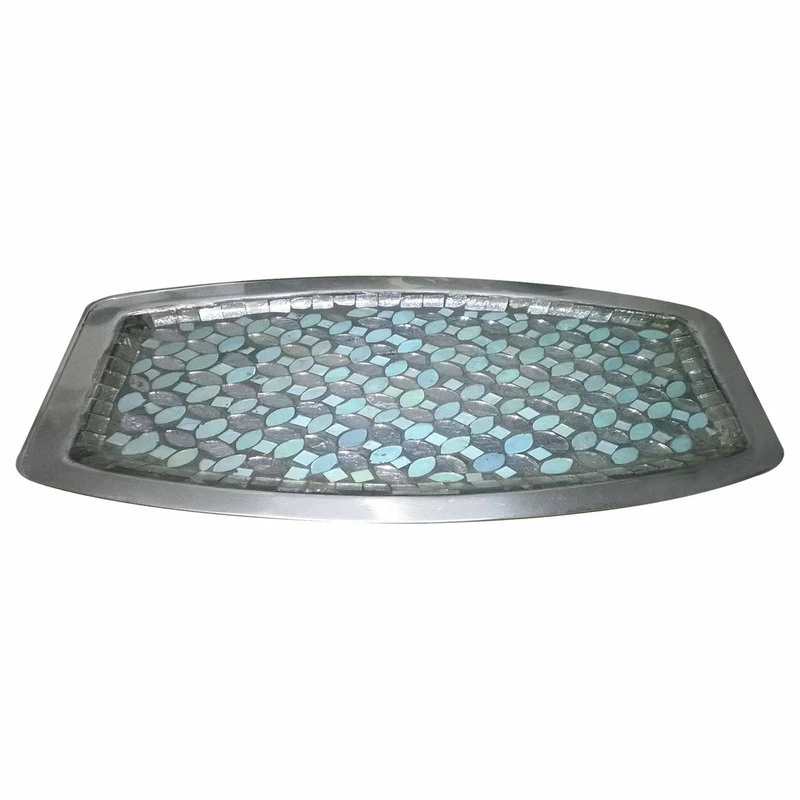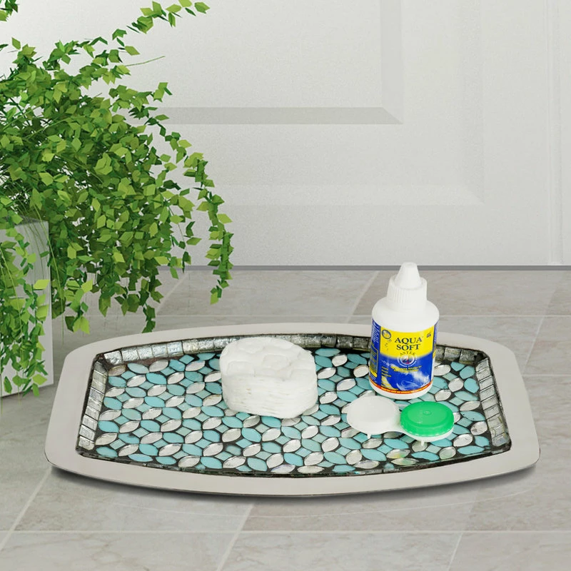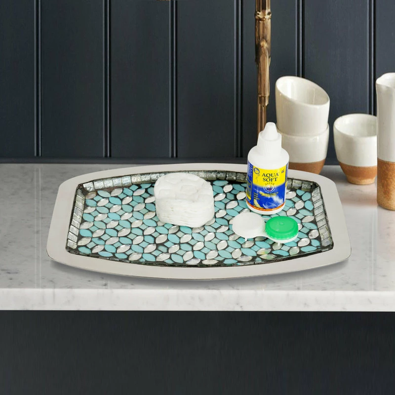 Bring the serenity of the ocean into your bathroom with this beautiful Sea Foam Amenity Tray. Featuring a mosaic pattern of blues and greens surrounded by a shining silver color, this tray is perfect for corralling bathroom accessories and jewelry. Pair this tray with other pieces from the Sea Foam collection for a cohesive look. This piece measures 11.5 inches wide by 7.5 inches deep by 0.5 inches tall.