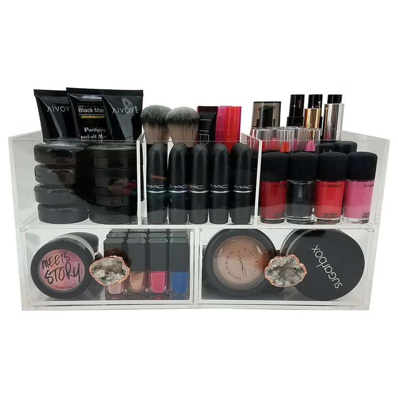 The Andrea is constructed of heavy duty premium grade clear acrylic. It features natural geode stone knobs in 3 optional colors with metallic coated finish for an elegant look. Includes a top tier cosmetic organization station with 3 large compartments for your lipsticks, glosses and much more. Two large bottom pull-out drawers each with their own geode knob.. Perfect for storing jewelry as well. The entire unit measures about 8.9″ x 5.5″ x 6.7″.