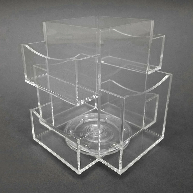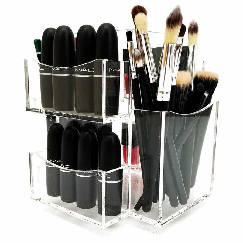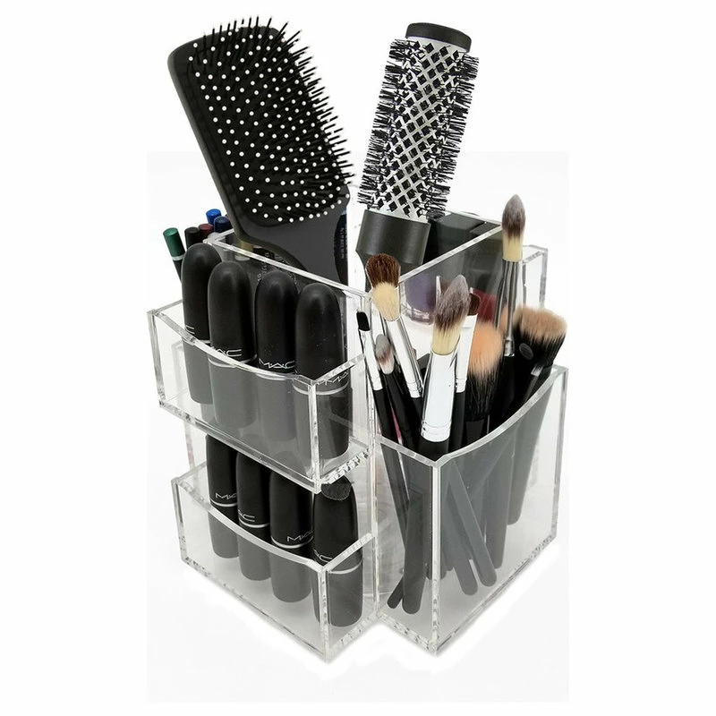 Our new Bianca Rotating Cosmetic Organizer Tray neatly stores all your makeup in one simple and awesome design. Constructed of heavy-duty clear acrylic, the Bianca Rotating Cosmetic Organizer Tray is completely hand-assembled and features a rotating base allowing you to turn and view your cosmetic assortment in 360-degree rotation. Features 6 storage bins on the sides along with a tall central storage bin for your brushes, combs, and other taller cosmetics. Overall height is 7″. Width is 6.7″ and depth is 6.7″. Perfect for the ultimate diva.