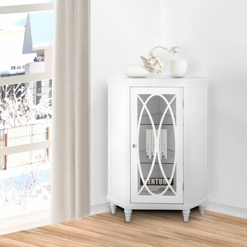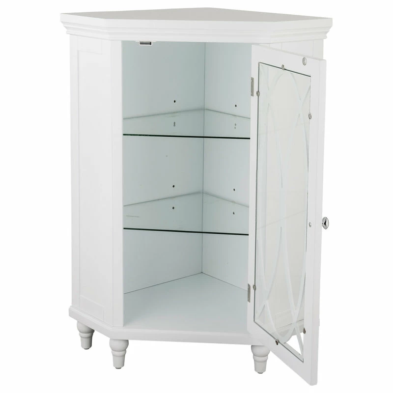 Upgrade your home storage while adding classic style with the Elegant Home Fashions Florence Corner Wooden Floor Cabinet with Adjustable Shelves. This stylish storage solution features a natural wood finish with 2 doors, and oval-shaped knobs that are finished in satin nickel for a timeless addition to your space. The 2 included adjustable glass shelves provide ample storage to reduce clutter and keep your home tidy. Constructed from durable engineered wood and tempered glass, this floor cabinet is built to provide you with long-lasting organization. Easy, step-by-step instructions and all of the hardware needed for installation are included for quick assembly. Purchase this stylish corner cabinet alone or with other items from the Florence collection for a cohesive, updated look. The Elegant Home Fashions Florence Corner Wooden Floor Cabinet with Adjustable Shelves measures 24.75″ x 17.5″ x 32″ and fits easily into corners to provide accessible storage without taking up too much space in your living area or bathroom.