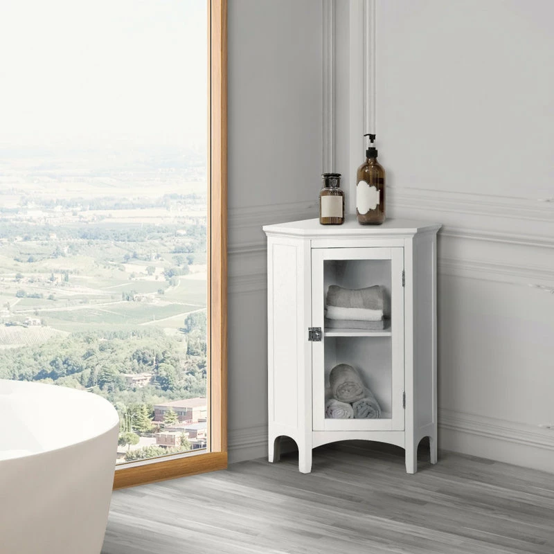 Upgrade your home storage while adding classic decor with the Elegant Home Fashions Madison Wooden Floor Cabinet with Glass Door. This decorative cabinet features a white finish with arched bottom skirting, a glass door, and chrome knobs for a beautiful addition to your space. The included fixed interior shelf helps to reduce clutter and keep your home tidy. Constructed from durable engineered wood and tempered glass, this floor cabinet is built to provide you with long-lasting organization. Easy, step-by-step instructions and all of the hardware needed for installation are included for quick assembly. Purchase this stylish cabinet alone or with other items from the Madison collection for a cohesive, updated look. The Elegant Home Fashions Madison Wooden Floor Cabinet with Glass Door measures 17″ x 24.75″ x 32″ and fits easily into corners to provide accessible storage without taking up too much space in your living area or bathroom.