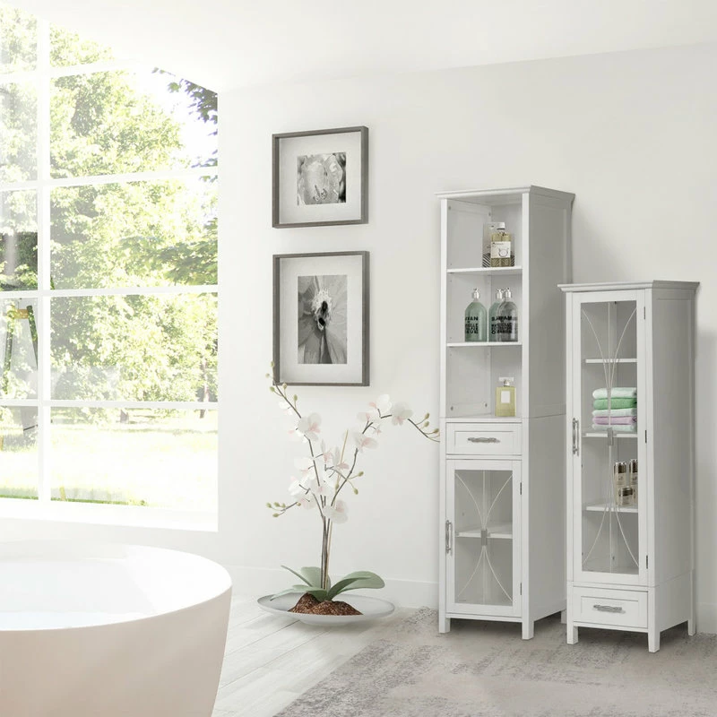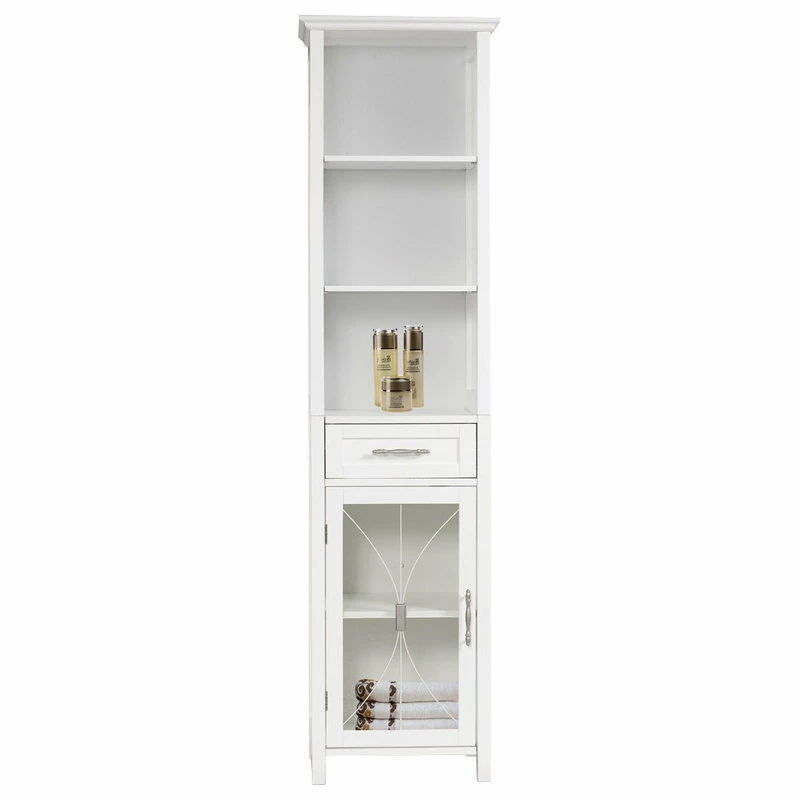 Upgrade your home storage while adding classic decor with the Elegant Home Fashions Delaney Wooden Linen Cabinet with Drawer and Open Shelves. This decorative cabinet features a white finish with a crown molded top, cathedral-style wire detail on the tempered glass-paneled door, and metal knobs for a beautiful addition to your space. The included 3 open shelves, middle drawer, and 2 adjustable bottom shelves help to reduce clutter and keep your home tidy. Constructed from durable engineered wood with anti-tipping hardware, this linen cabinet is built to provide you with long-lasting organization. Easy, step-by-step instructions and all of the hardware needed for installation are included for quick assembly. Purchase this stylish cabinet alone or with other items from the Delaney collection for a cohesive, updated look. The Elegant Home Fashions Delaney Wooden Linen Cabinet with Drawer and Open Shelves measures 13.5″ x 17″ x 65″ to provide accessible storage without taking up too much space in your living area or bathroom.