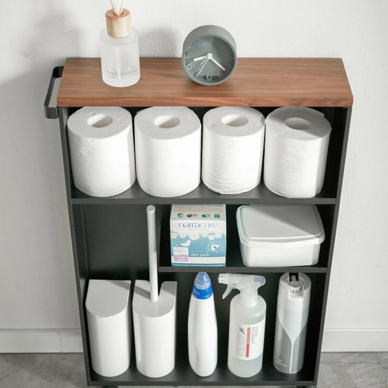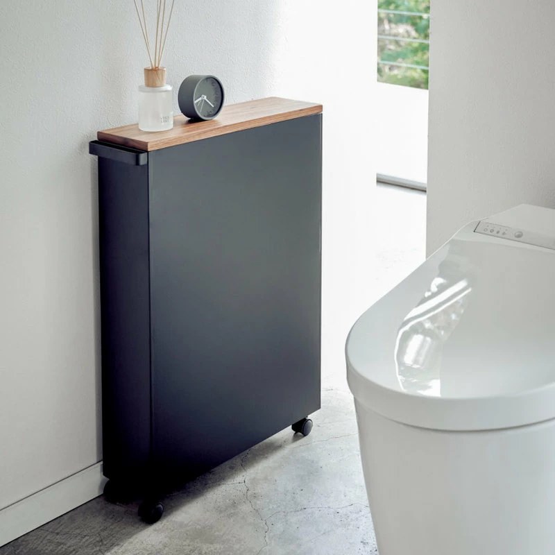 Store toilet paper, cleaners, and other bathroom products in this small, sleek, minimalist rolling bathroom cart. Its slim profile design makes it perfectly at home facing toward or away from walls, or nestled between tight spaces.